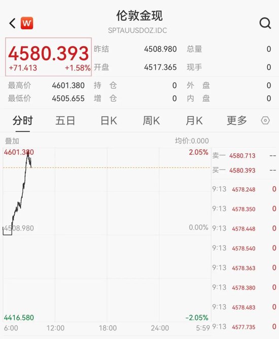 截至发稿,现货黄金报4580.393美元/盎司,日内涨1.58%。