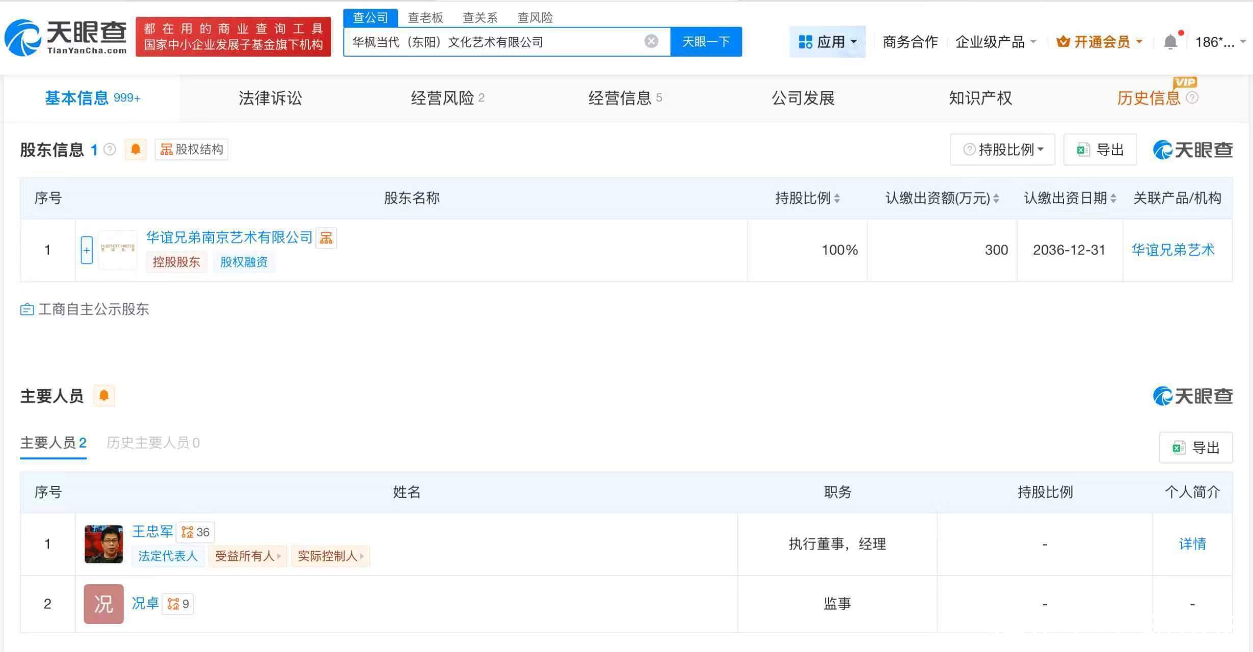 该公司成立于2017年11月,法定代表人、执行董事、经理为王忠军(王中军),注册资本300万人民币,由华谊兄弟南京艺术有限公司全资持股。公开信息显示,王忠军(王中军)为华谊兄弟创始人。